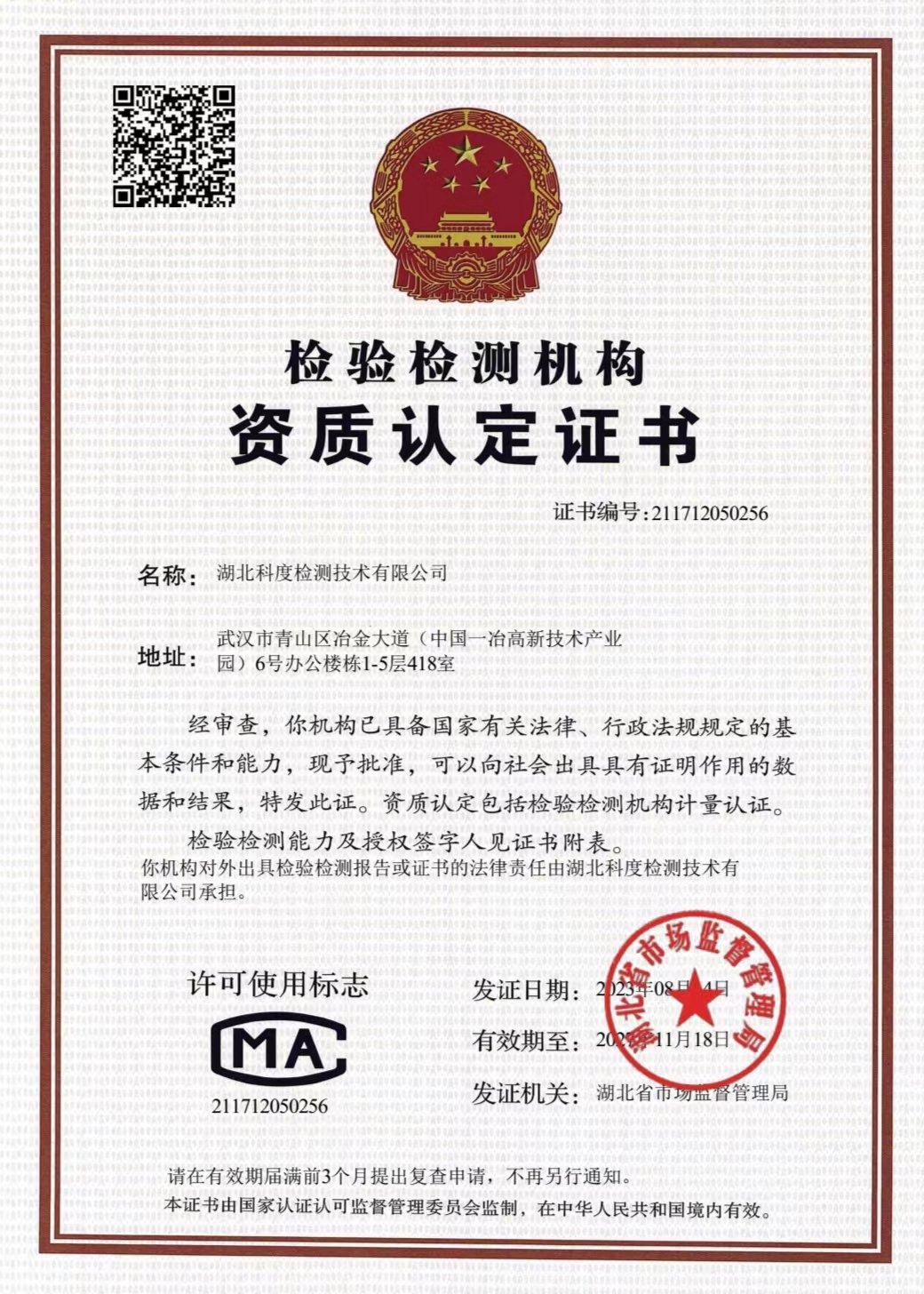 湖北科度檢測(cè)技術(shù)有限公司是一家專(zhuān)業(yè)從事環(huán)境類(lèi)及相關(guān)領(lǐng)域檢測(cè)的第三方檢測(cè)機(jī)構(gòu),公司已通過(guò)湖北省市場(chǎng)監(jiān)督管理局CMA計(jì)量認(rèn)證,可以面向社會(huì)出具權(quán)威CMA檢測(cè)報(bào)告。 我公司實(shí)驗(yàn)室嚴(yán)格按照國(guó)家標(biāo)準(zhǔn)建設(shè),擁有一大批國(guó)內(nèi)外先進(jìn)儀器設(shè)備及現(xiàn)代化配套設(shè)施,并有經(jīng)驗(yàn)豐富的中高級(jí)專(zhuān)業(yè)技術(shù)人員和嚴(yán)格的實(shí)驗(yàn)室質(zhì)量保證體系為項(xiàng)目運(yùn)作提供強(qiáng)力支撐。 作為第三方檢測(cè)機(jī)構(gòu),公司始終以高度的社會(huì)責(zé)任感經(jīng)營(yíng)企業(yè),以“公正、嚴(yán)謹(jǐn)、高效”為宗旨,依托專(zhuān)業(yè)的技術(shù)實(shí)力為客戶提供專(zhuān)業(yè)優(yōu)質(zhì)檢測(cè)服務(wù),受到政府、企業(yè)和社會(huì)各界的廣泛關(guān)注和認(rèn)可。